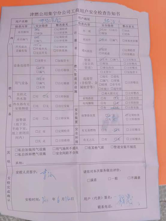 检查组对食堂等重点区域液化气瓶、燃气管道、灶具使用、燃气泄漏报警装置的安装及液化气瓶的储存、运输等情况进行重点检查,现场提出整改意见,并整合台账,安排专人跟进督促整改。