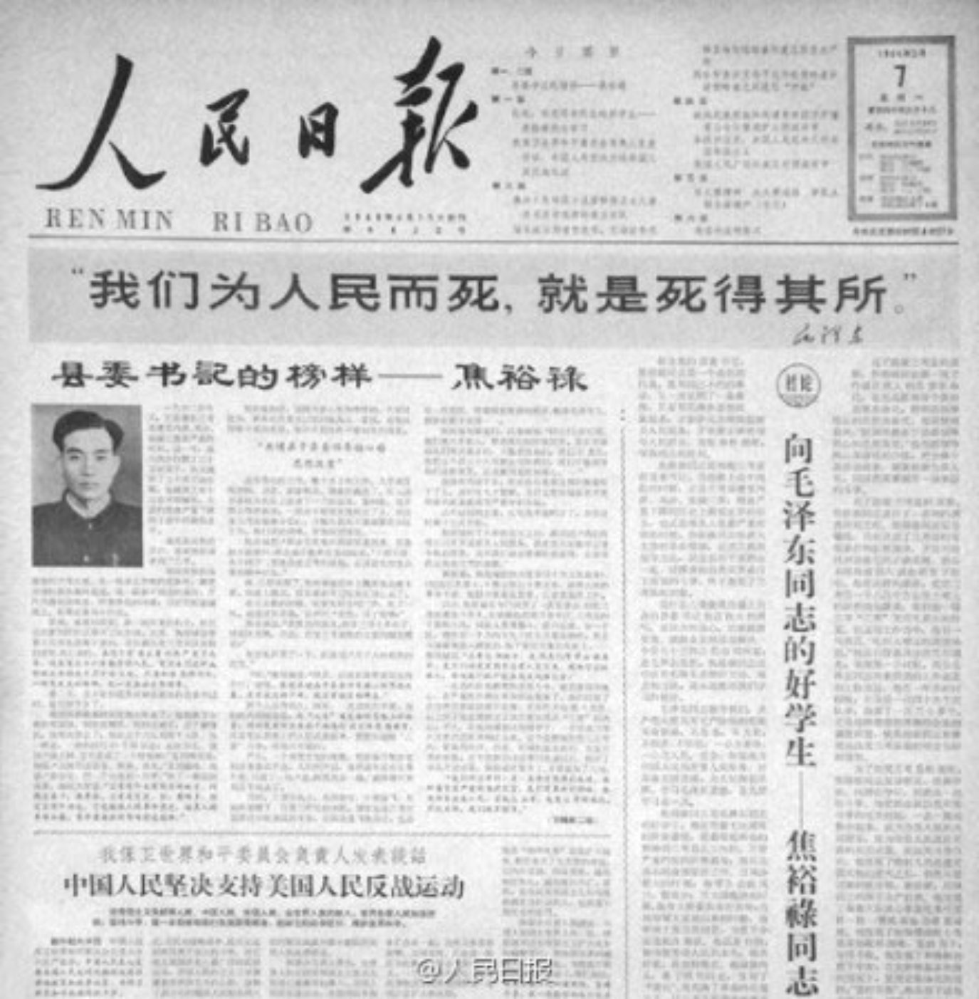 一年前,他还在兰考,同贫下中农一起,日夜奔波在抗灾斗争的前线。人们怎么会忘记,在那大雪封门的日子,他带着党的温暖走进了贫农的柴门;在那洪水暴发的日子,他拄着棍子带病到各个村庄察看水情。是他高举着毛泽东思想的红灯,照亮了兰考人民自力更生的道路;是他带领兰考人民扭转了兰考的局势,激发了人们的革命精神;是他喊出了“锁住风沙,制伏洪水”的号召;是他发现了贫下中农中革命的“硬骨头”精神,使之在全县发扬光大。……这一切,多么熟悉,多么亲切呵!谁能够想到,象他这样一个充满着革命活力的人,竟会在兰考人民最需要他的时候,离开了兰考的大地。