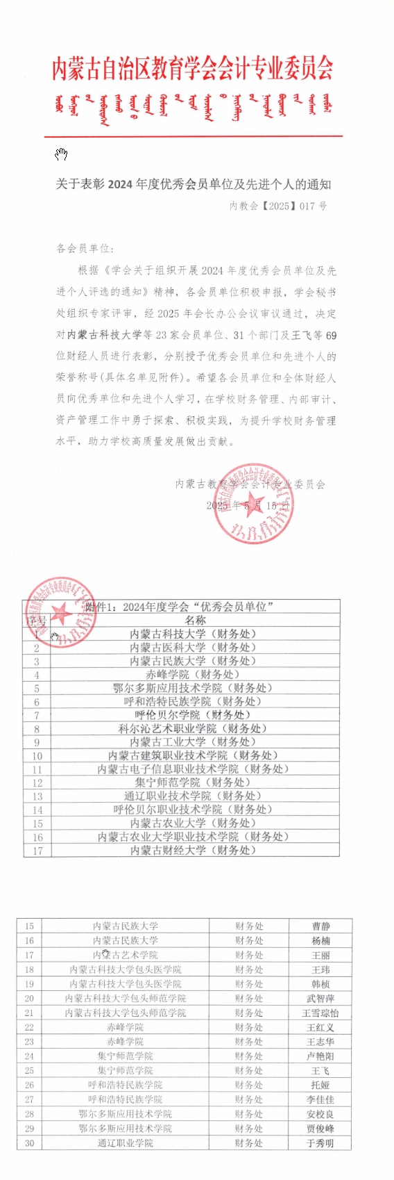 近日,内蒙古自治区教育学会会计专业委员会表彰了2024年度“优秀会员单位”和“优秀个人”,经单位申报、专家评审、会计专业委员会会长会议审议,PP电子游戏官网计划财务处荣获了2024年度“优秀会员单位”称号,同时,计划财务处2名同志被评为2024年度“先进个人”。
