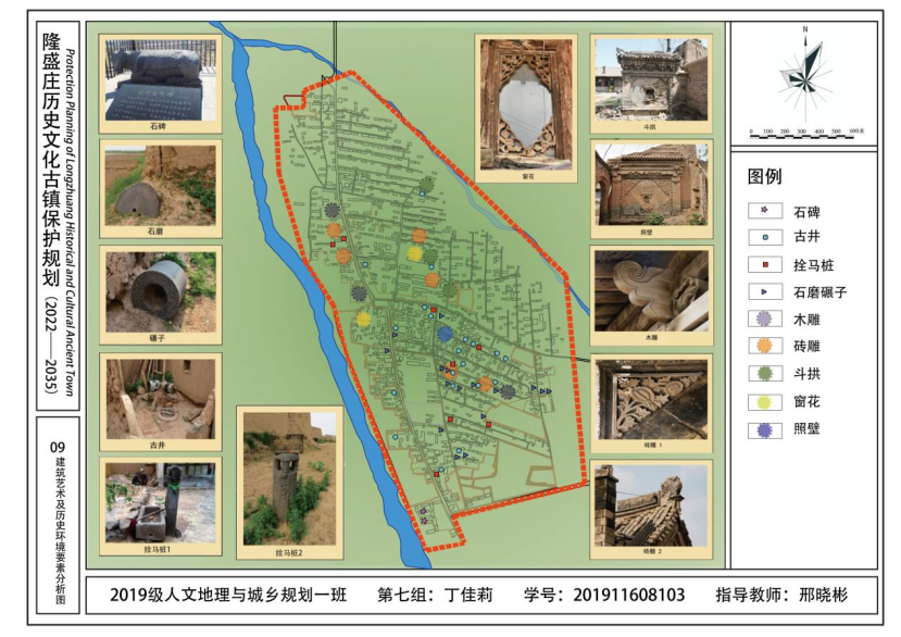 本次展出作品为2019级人文地理与城乡规划专业《城市详细规划》课程实践作业——隆盛庄历史文化名镇保护规划,指导老师为王腾、刘晓靓、李佳、邢晓彬。本课程在教学过程中将专业知识与乡土地理结合,培养学生爱国爱家乡,服务家乡的意识;通过分组实践,培养学生团队精神、合作意识;通过项目式学习,引导学生将所学专业知识和技能服务于社会,为家乡发展贡献自己的力量。