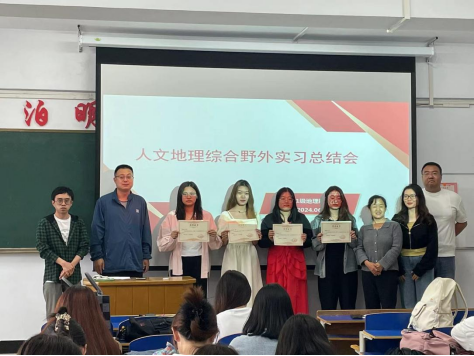 会上,首先为在本次野外实习过程中表现优异的同学颁发荣誉证书,2021级地理科学一班的陈倩影、党伟琪,2021级地理科学二班的陈昕莲、王佳媛获得表彰。并由陈倩影和王佳媛作实习总结汇报,两位同学从野外实习的准备工作、实习过程和实习报告等方面进行了交流、分享。
