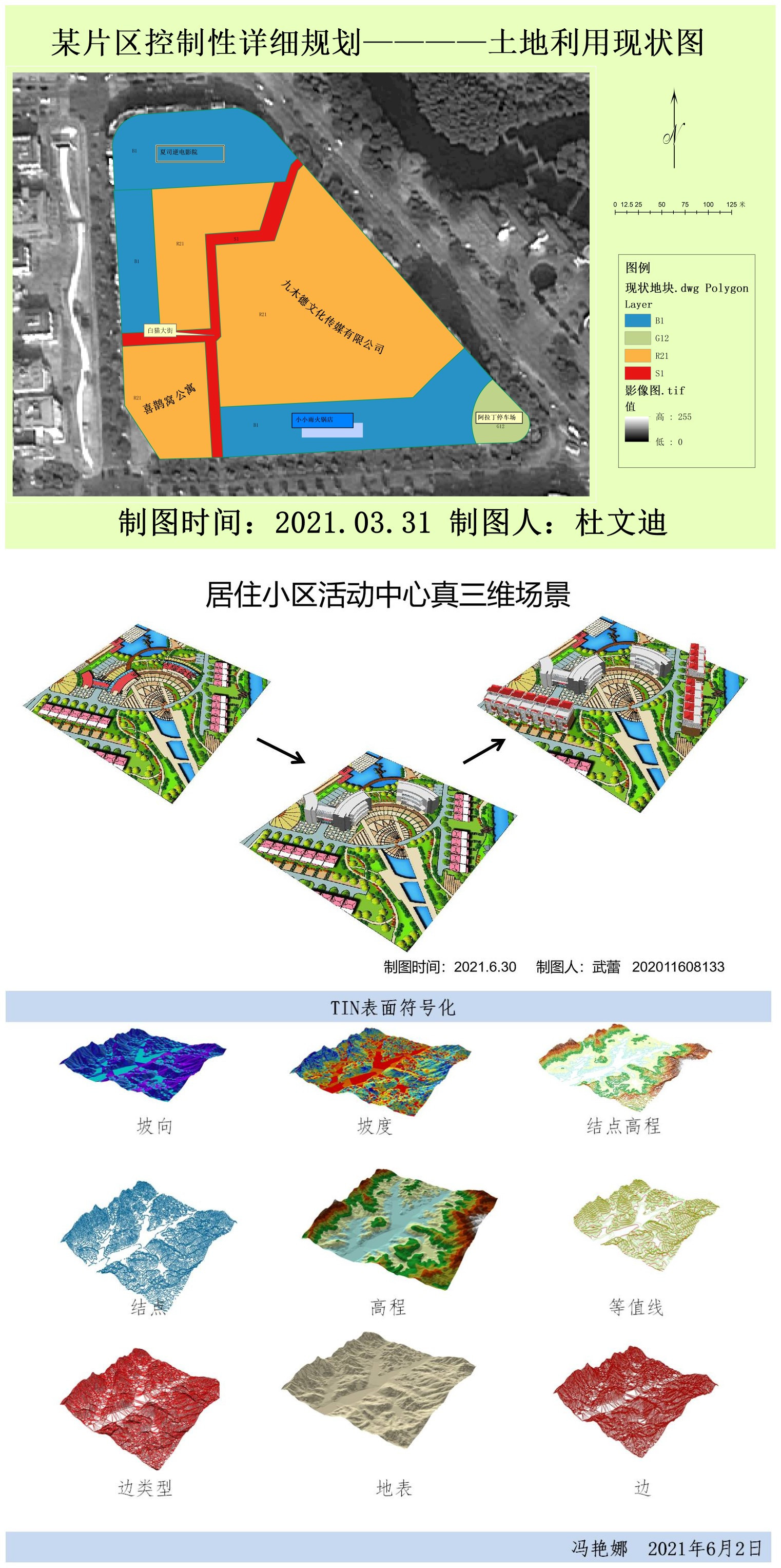 第一章《土地使用现状图》我们学习了基础的创建地图文档、创建GIS数据、操作图层、制作完整的图纸,通过本实验的学习,同学们了解了GIS的操作步骤,后来也在多个章节反复使用。第二章《现状容积率统计》中我们学习了建筑和地块的相交叠加、分地块统计和地块容积率的计算、地块容积率的可视化表达。使同学们掌握了现状容积率的快速统计方法。第三章《城市用地适宜性评价》中我们学会了栅格叠加运算与划分适宜性等级。第四章学习了《遥感图、规划图与原始地表面的叠加》。第五章学习《三维场景模拟》过程中,我们掌握了创建地表面与地表面间的相互转换。在接下来的章节中我们陆续学习了制作3D影像图、规划图与创建二维半建筑和场景。