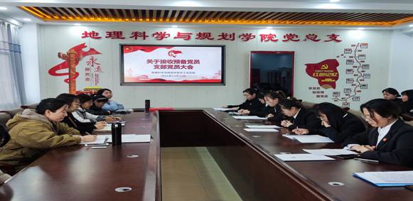 12月23日,地理科学与规划学院学工党支部在主教楼603召开了关于接收预备党员支部党员大会,本次会议由学工党支部书记赵娜主持,地理科学与规划学院学工支部全体党员出席了本次会议。