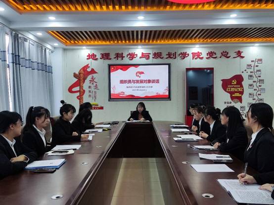12月23日,学校党委指派地理科学与规划学院党总支组织员黄倩同志与11名发展对象在主教楼603进行谈话。