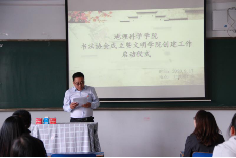 为深入贯彻落实立德树人根本任务、进一步培育和弘扬社会主义核心价值观、推动文明学院建设,9月17日地理科学学院在主教楼举行学院书法协会成立仪式,组织开展审美教育系列活动。PP电子游戏平台网站党委副书记刘春,党委委员、宣传部部长张富出席活动。