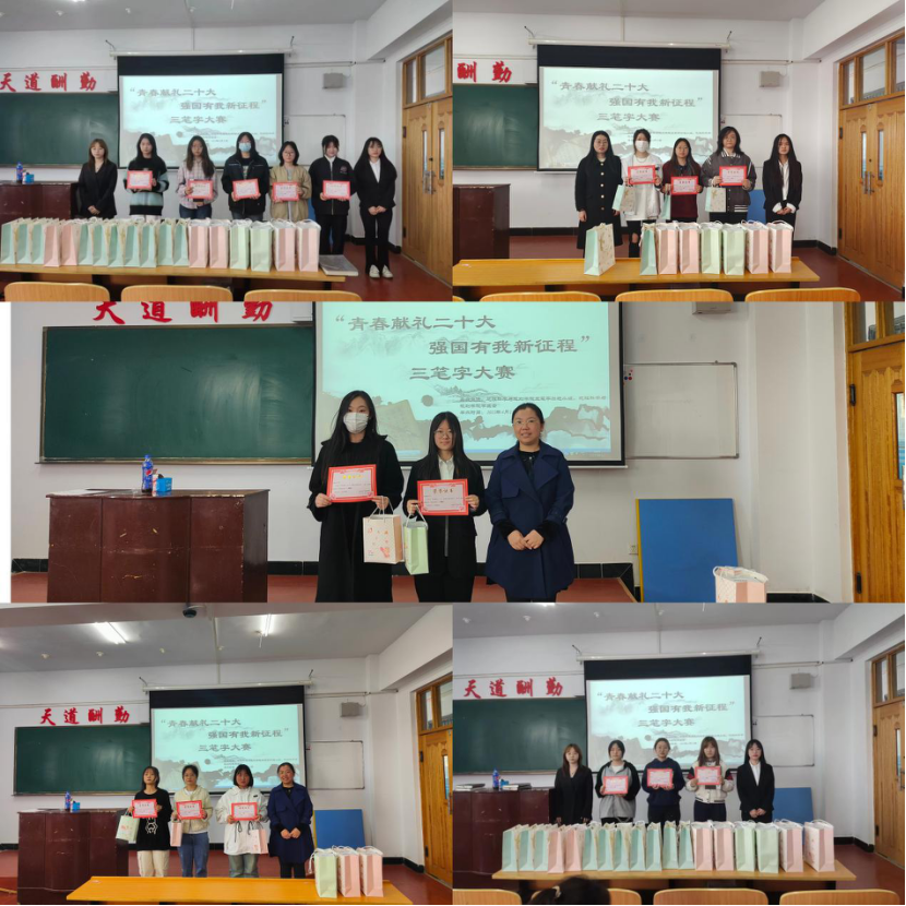 经过评委认真评选,最终评选出硬笔字组刘艺婧等3人获得一等奖,高美婧等6人获得二等奖,王喆等9人获得三等奖;粉笔字组祁可欣等2人获得一等奖,许胜男等4人获得二等奖,李志文等6人获得三等奖;毛笔字组魏庆如获得一等奖,王碧波等2人获得二等奖,许静苑等3人获得三等奖。