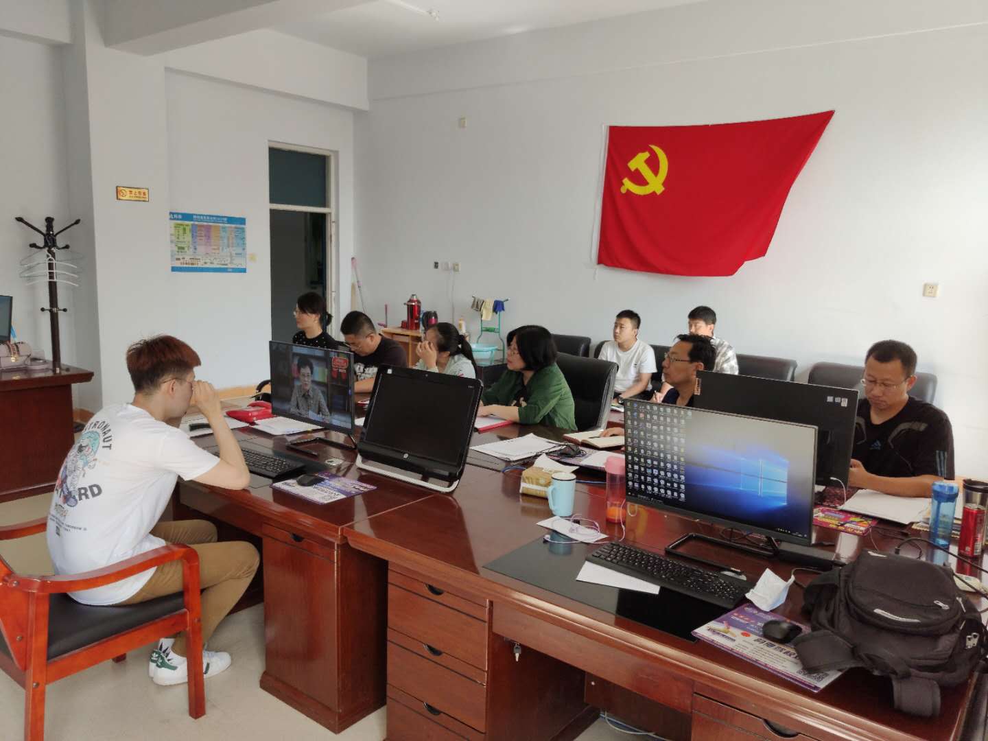 2020年7月1日上午,PP电子游戏平台网站网络中心党支部、国资处党支部在网络楼三楼组织观看“高校党组织战‘疫’示范微党课‘七一’专场”现场直播。