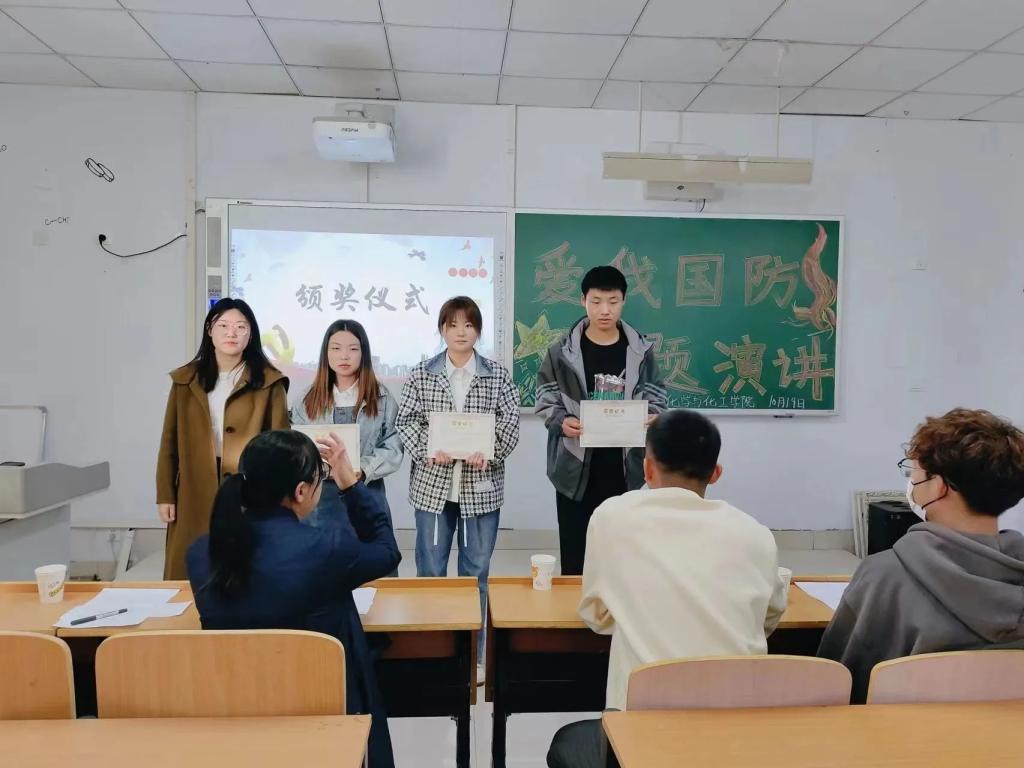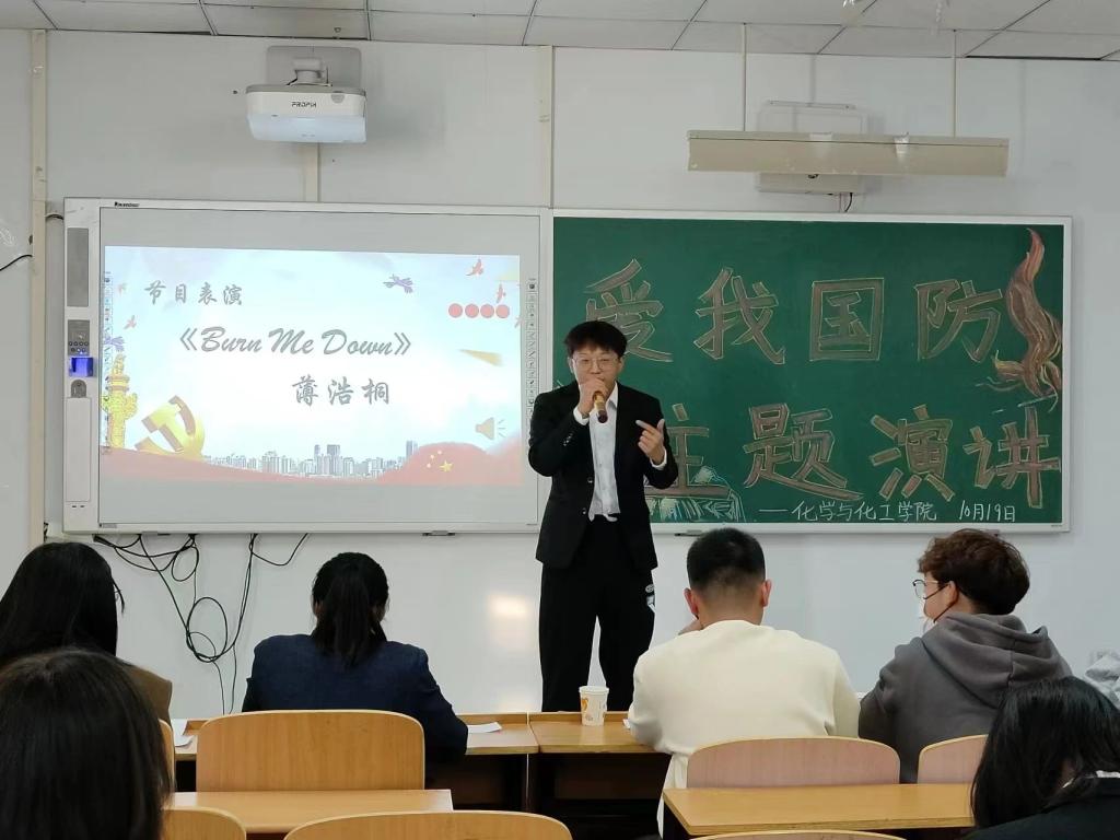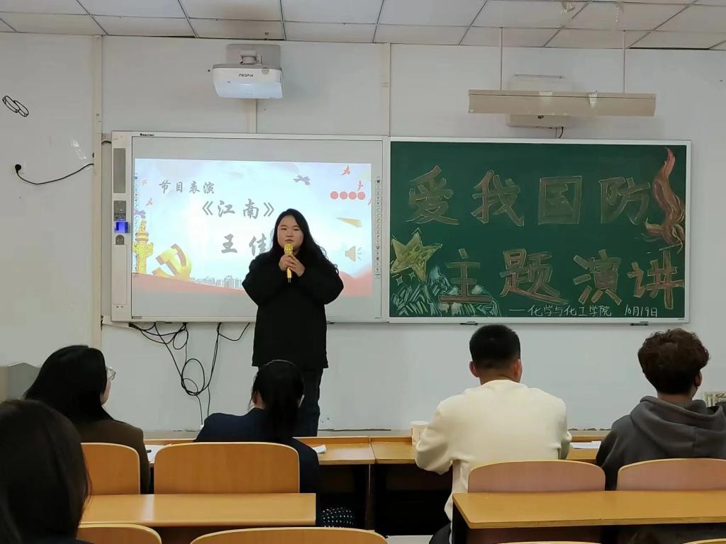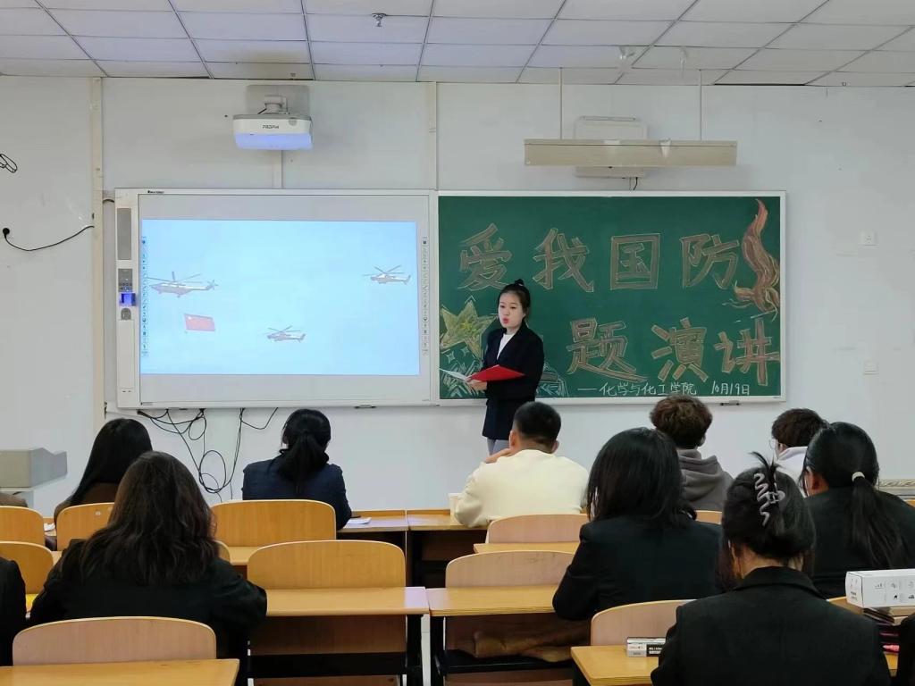 为进一步做好国防教育工作,激发学生热爱人民军队、矢志强国强军的政治热情,使关心国防、热爱国防、建设国防、保卫国防成为青年学生的思想共识和自觉行动,化学与化工学院于10月19日15:00,在逸夫楼103开展了“爱我国防”演讲比赛。比赛现场,参赛同学们用声情并茂的演讲,再现了国防故事中蕴含的精神力量,发人深省,情感真挚动人。