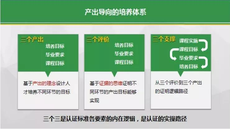 “三个三”指产出导向的培养体系中“三个产出、三个评价、三个支撑”,是师范认证标准各要素的内在逻辑,是认证的实操路径。(图一)