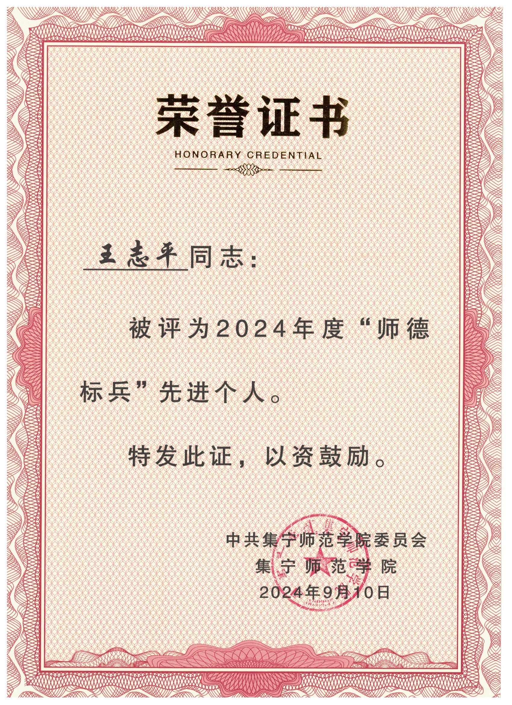 王志平老师在任职以来先后获得多种荣誉:1994年被乌盟行政公署评为“先进教育工作者”;2007年学生军训被评为“优秀带训教师”;2009年承担的《有机化学》课程被评为校级精品课程;2016年被评为PP电子游戏平台网站“2015年维护稳定暨综合治理工作”先进个人;2017年担任的课程教案被评为学校“2017年优秀教案”、2018年他所在的应用化学专业核心课程团队被学校评为“校级优秀教学团队”、2023年承担的有机化学课程群被评为PP电子游戏平台网站课程类教学创新团队;2023年指导学生参加第十三届挑战杯全区大学生课外学术科技作品竞赛中获得校级二等奖、区级三等奖。