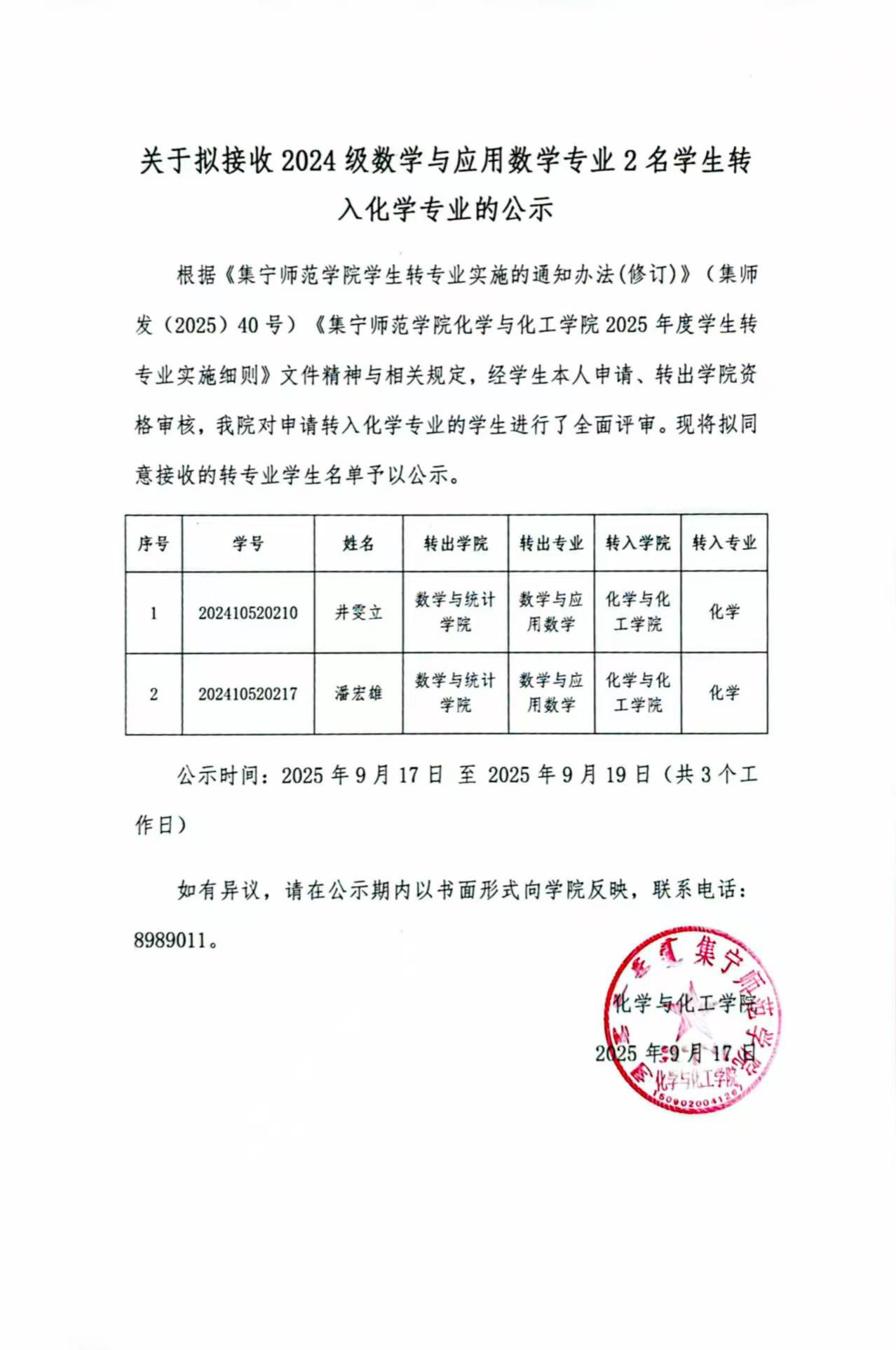 关于拟接收2024级数学与应用数学专业2名学生转入化学专业的公示