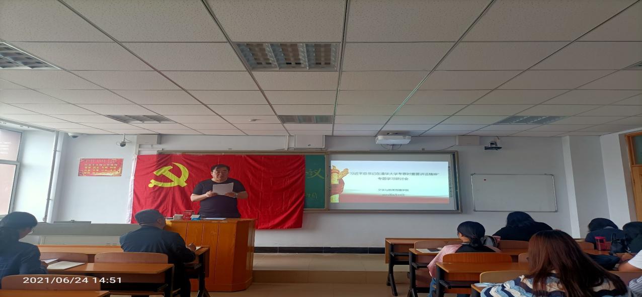 文学与新闻传播学院教师党员郝青山领学了习近平总书记在清华大学考察时重要讲话精神的内容。