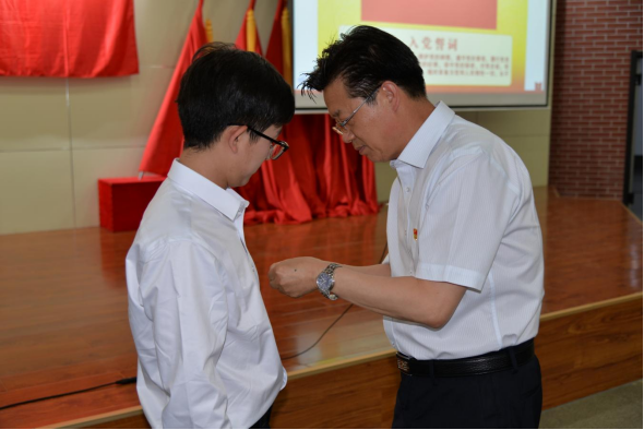 党委书记朱玉东为新发展教师党员代表佩戴党徽