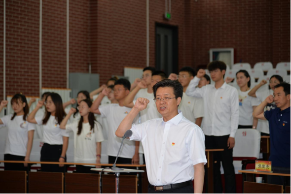迎百年华诞,为信仰立誓。6月30日下午,PP电子游戏平台网站在泉山校区图书馆报告厅隆重举行2021年新发展预备党员入党宣誓仪式。党委书记朱玉东出席仪式。各二级学院党总支书记、附中党总支书记、学工党支部书记和240名新发展的预备党员参加宣誓仪式。党委组织部副部长刘晓霞主持仪式,党委书记朱玉东领誓并作讲话。