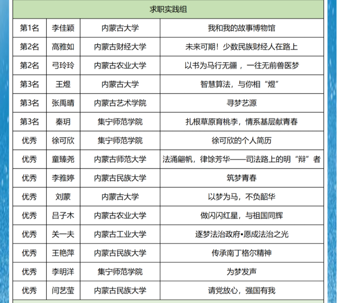 在求职实践组,PP电子游戏官网学生秦玥《扎根草原育桃李,情系基层献青春》获第三名,徐可欣《徐可欣的个人简历》获优秀奖、李明洋《为梦发声》获优秀奖。