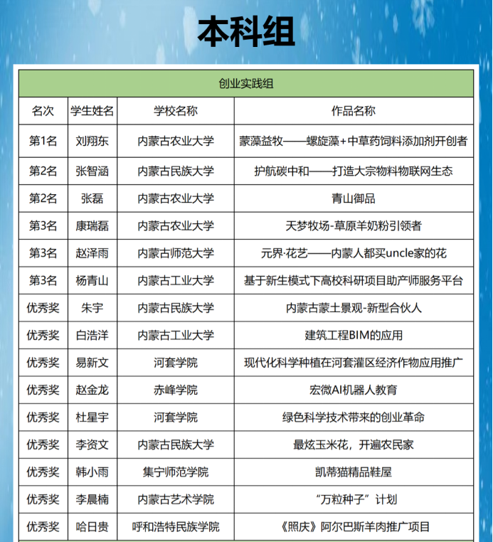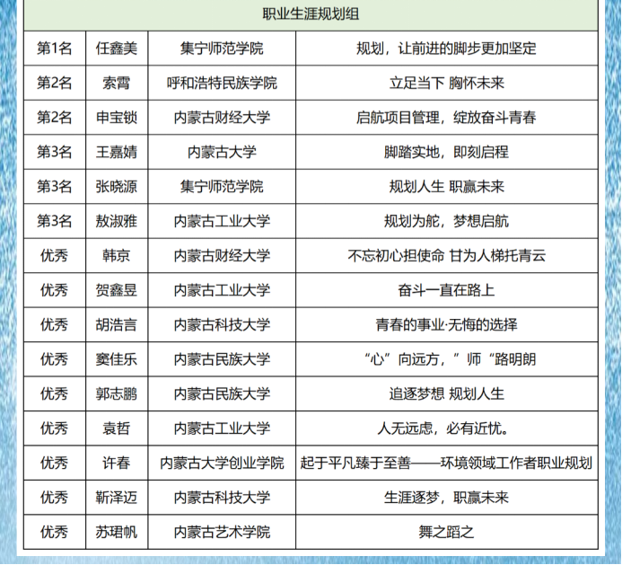 第二届沿黄五省区大学生就业创业大赛内蒙古赛区总决赛落下帷幕,经过各二级学院初赛、学校招生就业处组织校赛后推荐学生参加自治区三个组别总决赛,共有6名学生获奖。
