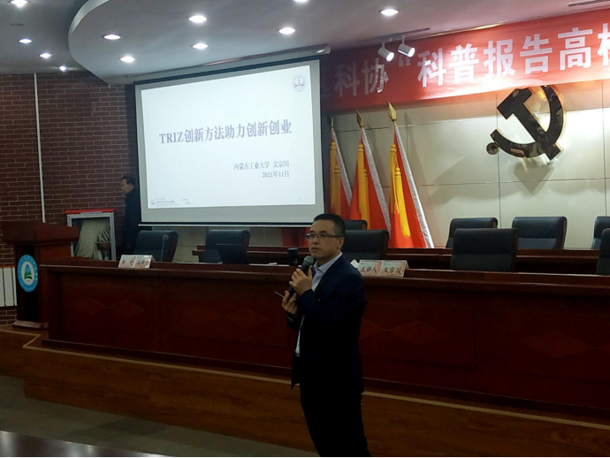 本次报告的主题是“TRIZ创新方法助力创新创业”,特邀内蒙古工业大学人文学院院长、经济管理学院教授文宗川博士主讲,文教授的报告从发人深省的问题开始,系统讲解了高校人才培养的“四力”模型、创新的方法、创新创业大赛基本情况介绍、高校双创工作的建议等内容。