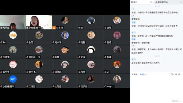尚志清以自身经历围绕教师招考信息搜集的渠道、笔试复习的方法和手段、面试技巧和流程、复习备考和经验技巧融会贯通、各地区教师招考的差异和选择等方面与历史学18级、19级学弟学妹们分享了就业经验和感悟。她中肯地鼓励大家清醒认识自己,明确职业规划目标,合理安排学习时间,抓住就业机会,永远都不能说我不行,只能说我努力,我就行。交流会气氛融洽,同学们反应热烈,纷纷提出心里的疑惑和问题,针对同学们提出的问题,尚志清逐一进行了有针对性的解答,在一个半小时的时间里大家进行了充分的交流学习。