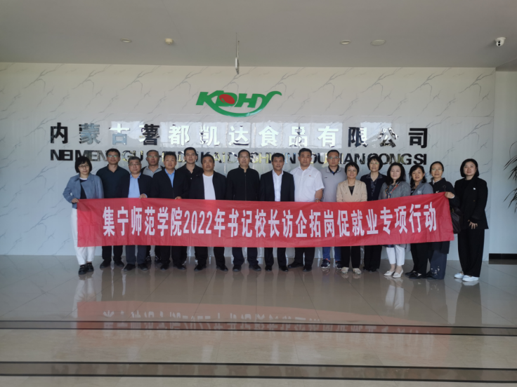 5月30日下午,校党委委员、副校长梁政、李景杰,党委委员、科技处处长李平等一行深入察右前旗国家现代农业产业园开展访企拓岗工作。教务处姚玉阁,文学与新闻传播学院李俊,外国语学院闫晓云,数学与统计学院何永峰,化学与化工学院徐松鹤,生命科学与技术学院张军儒,美术与设计学院蔚淑英、乌日娜,地理科学与规划学院刘晓霞、刘彩凤,计算机与大数据学院孙登高、邢德胜,察右前旗教育体育局副局长曹明亮、察右前旗国家现代农业产业园研学基地第三方运行负责人王美兰陪同走访。内蒙古薯都凯达食品有限公司办公室主任石蔼童介绍了公司情况。