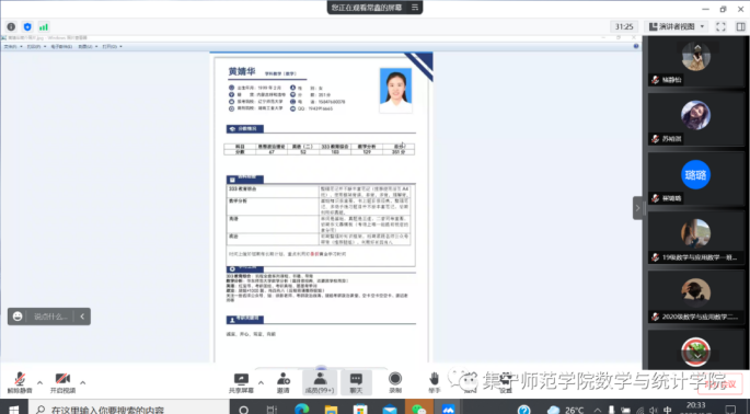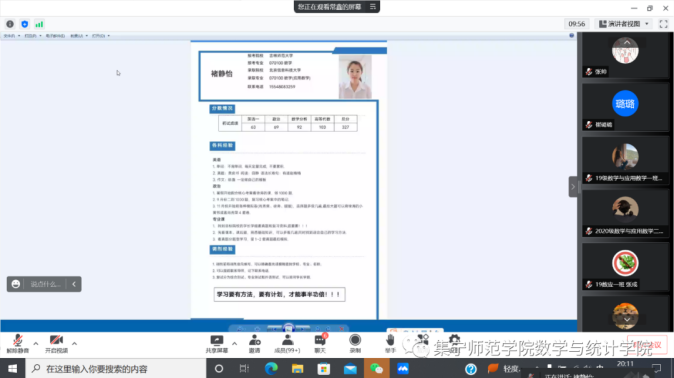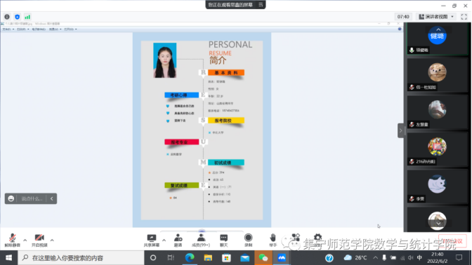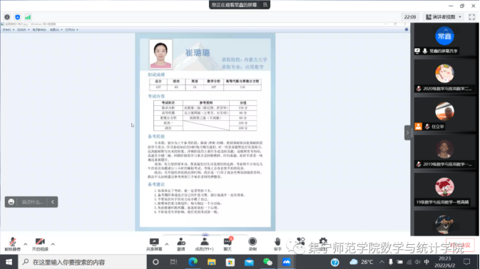 6月8日,数学与统计学院组织召开2022届信息与计算科学专业优秀毕业生就业分享会。本次分享会由学团办负责人高霞老师主持,党总支副书记常鑫老师、副院长张越老师及各班班主任出席会议。数学与统计学院2018级、2019级、2020级、2021级信息与计算科学专业全体学生参加会议。四名高质量就业的同学根据自身就业经历,从专业就业方向、工作技术需要、学习路线、需要备考的课程,求职准备工作、岗位的选择、技术学习途径推荐、面试注意事项等方面给同学们做了全面的分享。