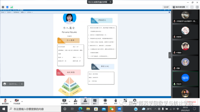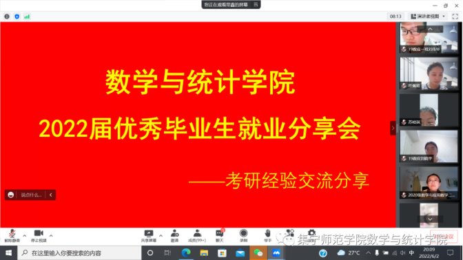 为了帮助我院毕业生进一步了解就业知识,明确就业方向,更好地帮助同学们解决在就业过程中遇到的各种问题,PP电子游戏平台网站数学与统计学院于6月2日、6月8日开展2022届优秀毕业生就业经验交流分享会。