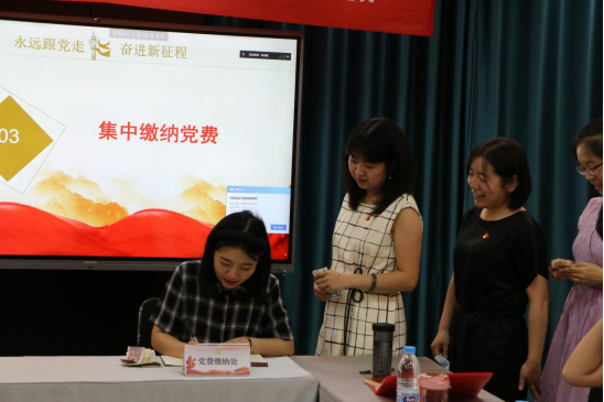 线下参会的每一位党员佩戴党徽,亮出党员身份,依次按照党费标准现场集中足额缴纳了7月份的党费。使每一位党员深刻认识到按期足额交纳党费不仅是每个党员应尽的义务和责任,也是党员党性修养、牢记党员身份、践行党员使命的具体体现。