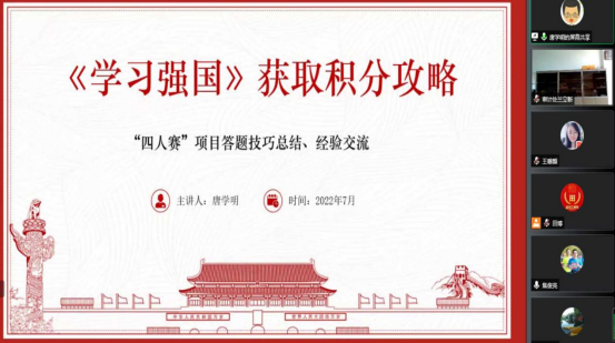 唐学明作为PP电子游戏官网“学习强国”学用标兵和积分冠军,分享了在“学习强国”平台学习使用过程中提高自身理论水平、自身修养的经验、方法,就学习强国各项积分的获取、“四人赛”的答题技巧、“挑战答题”题库内容、学用过程注意事项等进行了详细的介绍。