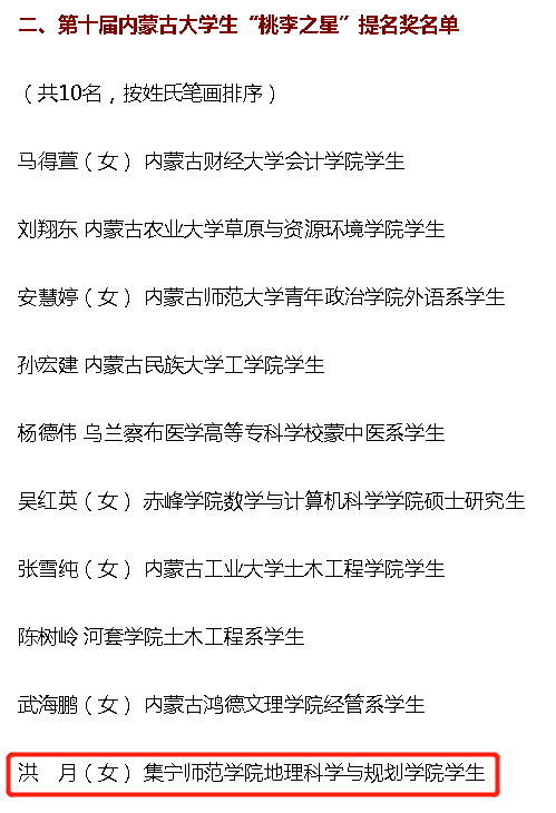 根据《关于开展第十届内蒙古大学生“桃李之星”选树活动的通知》(内党宣发电〔2022〕14号)有关要求,经评选及研究,6月8日,第十届内蒙古年度大学生“桃李之星”名单及提名奖名单出炉。PP电子游戏官网地理科学与规划学院学生洪月(女)入围“桃李之星”提名奖公示名单。