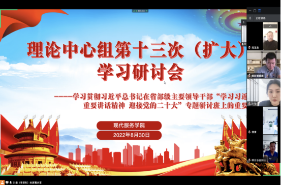 8月30日PP电子游戏平台网站现代服务学院党总支组织召开第十三次理论学习中心组(扩大)学习研讨会,学习贯彻习近平总书记在省部级主要领导干部专题研讨班上重要讲话精神。校党委书记朱玉东巡听本次学习研讨会。会议由学院党总支书记李荣利主持,学院理论学习中心组全体成员并扩大到环节干部及全体党员参加了会议。学习研讨会首先由现代服务学院院长王汉君领学讲话精神,随后老教授老党员代表黄中,党总支副书记李贞,教师党支部书记王晓玉,教学科研科科长张旭虹,农工党、党外知识分子代表刘小番,归国留学教师代表沈佳雯分别就讲话精神进行了交流研讨。