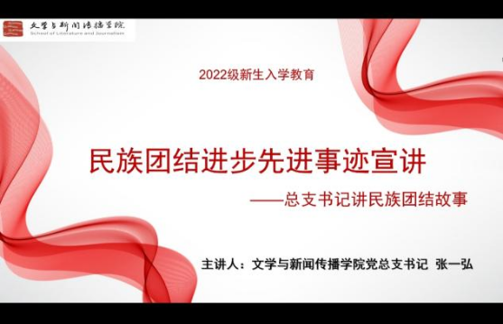 为进一步加强学校民族团结进步教育工作,铸牢各族师生中华民族共同体意识,9月21日,文学与新闻传播学院举办2022级新生入学教育暨“民族团结进步先进事迹宣讲”活动,党总支书记张一弘担任主讲,学院2022级298名新生参加活动。