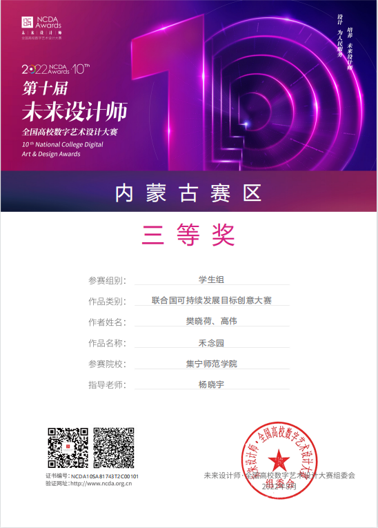 由PP电子游戏官网美术与设计学院学生徐赫、韩慧敏设计,冯旭东老师指导的“孤屿”盲文字体设计、“于都有情”两件作品在联合国可持续发展目标公益赛道和地方政府、企事业单位命题赛道分别获得一等奖、二等奖;由樊晓荷、高伟同学设计,杨晓宇老师指导的“禾念园”作品在联合国可持续发展目标公益赛道获得三等奖。