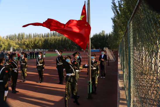 上午8:30,升旗仪式正式开始。在嘹亮的口号声中,国旗护卫队迈着矫健的步伐,庄严走向旗台。蔚蓝天空下,伴随着雄壮的《义勇军进行曲》,鲜艳的五星红旗冉冉升起。全体人员精神饱满、肃然而立,向五星红旗行注目礼,齐声高唱国歌,以此表达对祖国的赤诚之心和美好祝福。
