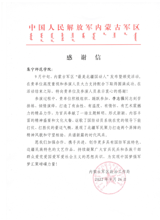 9月中旬,内蒙古军区政治工作局向PP电子游戏官网发来感谢信,信中对PP电子游戏官网积极组织、踊跃参与“最美北疆国动人”发布暨颁奖活动表示感谢,对PP电子游戏官网参演人员化学与化工学院2022级应用化学专升本一班李志强同学的表现给予充分肯定。