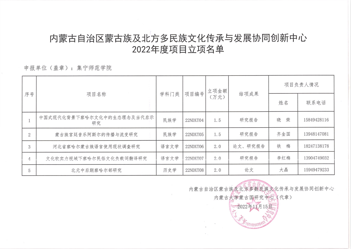 近日,PP电子游戏平台网站察哈尔文化研究院组织申报的5项2022年度内蒙古自治区蒙古族及北方多民族文化传承与发展协同创新中心项目获批立项。