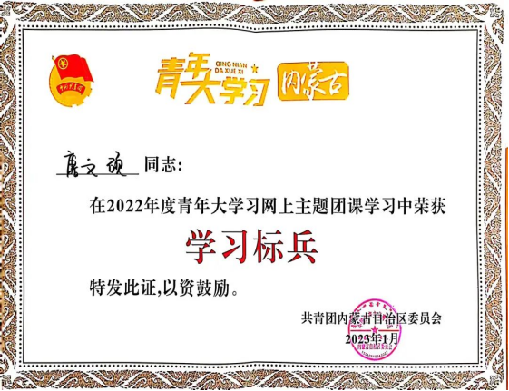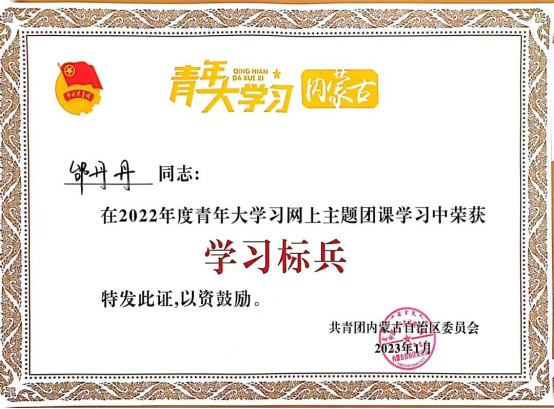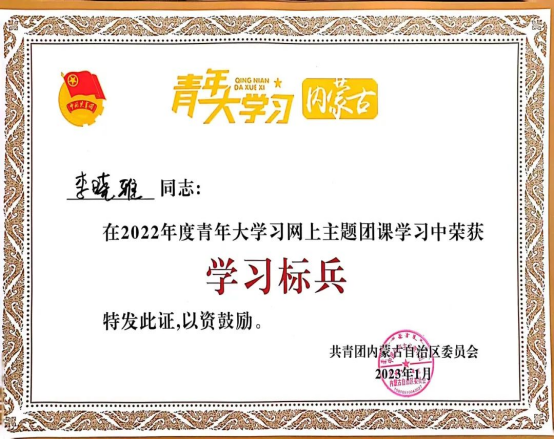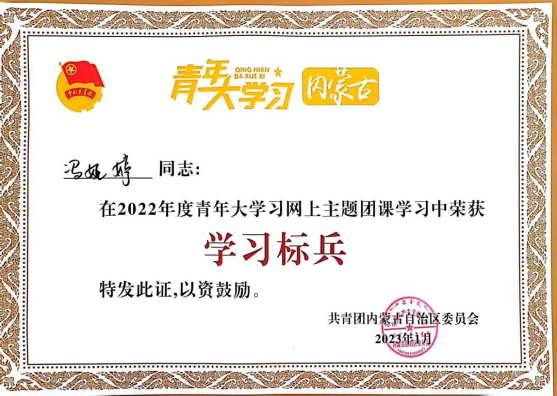 近日,共青团内蒙古自治区委员会公布了2022年度“青年大学习”网上主题团课学习标兵的名单,PP电子游戏官网学生唐文硕、李晓雅、冯娅婷、邰丹丹、王凤春在2022年度青年大学习网上主题团课学习中荣获“学习标兵”的荣誉称号。
