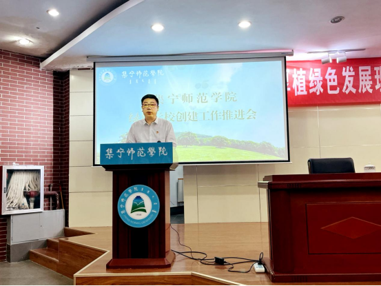 为全面学习贯彻落实习近平生态文明思想,进一步完善PP电子游戏官网生态文明教育工作长效机制,在全校厚植绿色发展理念,培养广大师生简约适度、绿色低碳、文明健康的生活方式,推进绿色学校创建。9月15日下午,PP电子游戏官网在泉山校区图书馆报告厅召开绿色学校创建工作推进会。校党委副书记、校长刘春,副校长李凤斌,校党委委员、副校长李景杰、拓俊杰出席,乌兰察布市绿色产业发展办公室党组书记、主任续集红,全校正处级干部、学生代表参加会议。大会由拓俊杰主持。