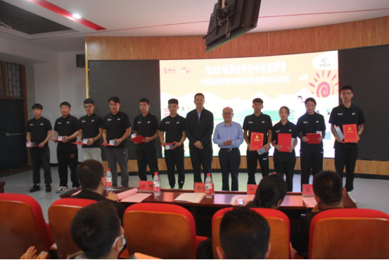 出征仪式上,体育与运动学院院长侯勇宣读了志愿者名单,20级学生姜浩代表学生志愿者进行发言。与会领导向支教志愿者颁发证书,阿丽娅向支教志愿者代表授旗,志愿者代表白雪岗带领全体志愿者进行庄严宣誓。