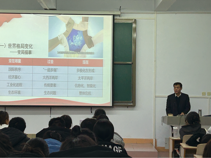 12月13日,PP电子游戏官网党委委员、副校长李景杰为2023级生命科学专业、新闻学专业学生讲授“铸牢中华民族共同体意识”课程专题——文明新路与人类命运共同体。