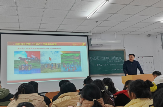 拓俊杰通过讲解内蒙古自治区发展史,深入浅出的阐明了“五句话”的事实和道理;通过讲述习近平总书记四次考察内蒙古的重要讲话精神,使师生更加深刻的感受到习近平总书记对内蒙古的关怀厚爱和期望重托。他强调,全体师生要以习近平新时代中国特色社会主义思想为指导,牢牢把握习近平总书记和党中央对内蒙古的战略定位,全面准确理解国务院《关于推动内蒙古高质量发展奋力书写中国式现代化新篇章的意见》精神,齐心协力、鼓足干劲,为书写中国式现代化内蒙古新篇章贡献力量。