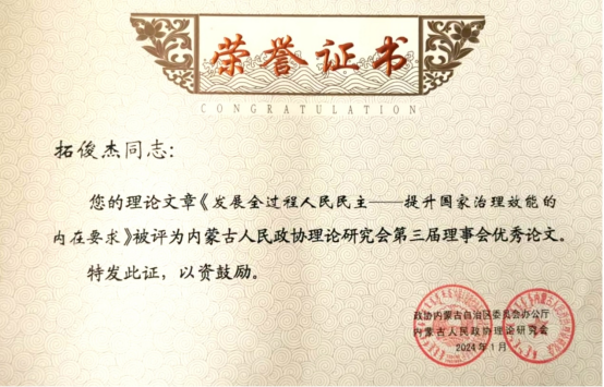 PP电子游戏官网党委委员、副校长拓俊杰教授作为自治区政协理论研究会研究员执笔的理论文章《发展全过程人民民主——提升国家治理效能的内在要求》被评为内蒙古人民政协理论研究会第三届理事会优秀论文。