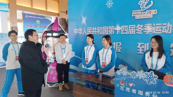梁政与志愿者进行了座谈交流,详细了解了志愿者的工作和生活情况,并鼓励他们积极践行志愿服务精神,克服困难,圆满完成“十四冬”志愿服务工作。他还走访了各个工作岗位,与正在服务的“小雪团儿”热情交流,对大家的工作给予了高度评价,充分肯定了他们的辛勤付出,赞扬了志愿者们在赛事中展现的无私奉献精神。