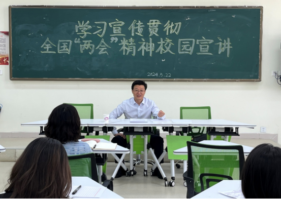 5月22日,校党委书记朱玉东深入蒙古学学院所联系班级2022级学前教育1班,开展学习宣传贯彻全国“两会”精神宣讲。