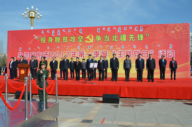 为深入贯彻落实党的十八届六中全会精神和自治区党委关于加强党内政治生活的部署要求,扎实推进“全市加强和规范党内政治生活推进年”活动,4月14日,中共乌兰察布市委办公厅在集宁新区中心广场组织开展2017年第一季度“主题党日”活动。自治区副主席、市委书记艾丽华出席并作重要讲话。市长费东斌主持此次活动。