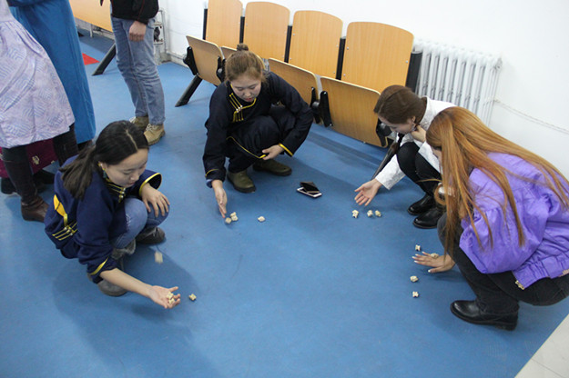 沙嘎文化是蒙古族传统文化的重要组成部分,蕴含着蒙古族特有的精神价值和思维方式,体现了蒙古族人民悠久的历史文明、生活习俗。为了有效传承、弘扬和发展沙嘎游戏文化,能够使现代大学生进一步了解沙嘎文化,提高大学生的民族文化、民俗意识,丰富大学生文化生活,蒙文系团总支、《奥特尔》小品协会、《蒙古元音》协会于11月10日特举办《八音图海》沙嘎游戏比赛。比赛设有弹沙嘎、抓沙嘎、沙嘎赛马、掷沙嘎四个项目。选手穿着民族服饰参赛,经过激烈角逐,斯琴、边巴、都兰、娜和娅分别获得四个项目的冠军。系党总支书记青龙、系主任南斯力玛、语言教研室主任乌恩其、团总支书记白秀梅、办公室主任吉日格拉老师观赛。