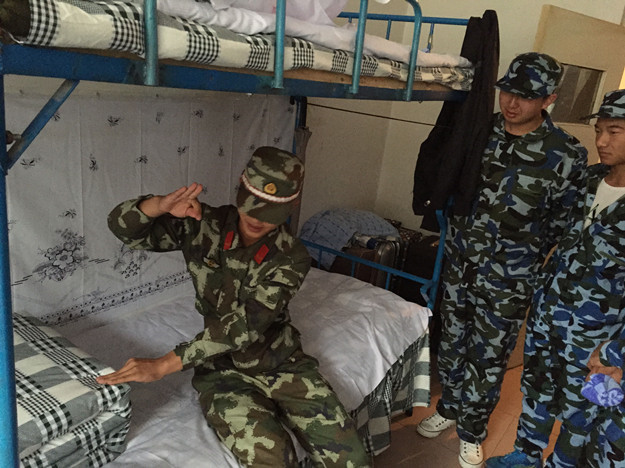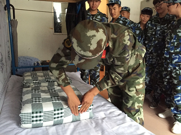 军训期间,泉山校区公寓中心为督促新生养成良好的生活习惯,促进文明宿舍建设,9月10日,学生处副处长曹普庆、公寓中心部分老师、军训教官以及各楼楼长深入2015级军训学生寝室进行检查,军训教官向同学们强调内务整理的重要性,并亲自示范该如何叠被子、摆放桌上物品、放置洗漱用品等。教官们细致耐心的讲解,使同学们了解到宿舍内务整理的重要性。