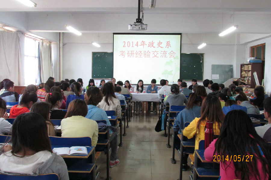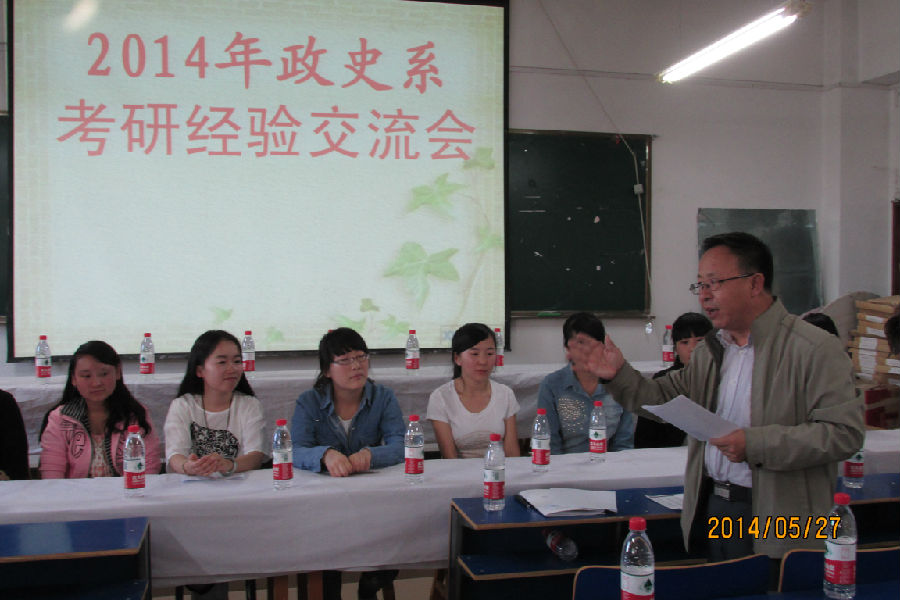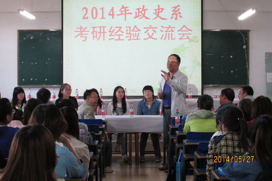 5月27日下午,政史系在主教楼举办了2014年考研经验交流会,校党委副书记张利平莅临现场并作动员讲话。