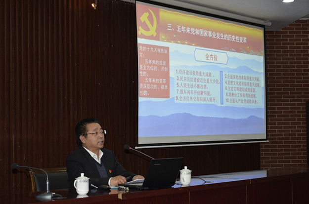 郭经纬首先宣讲了十九大召开的基本情况和重要意义,十九大报告的总体思路和主题,五年来党和国家事业发展的历史性变革。并通过“新定向、新定位、新判断、新定标、新定法、新要求”“6个新”对十九大报告的重点作了解读。