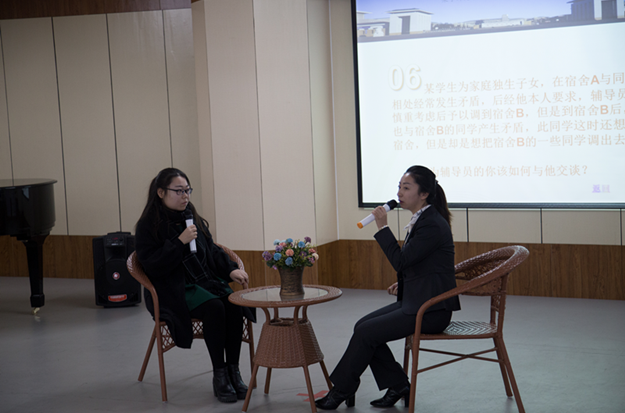 竞赛由主题班会、案例分析、主题演讲、谈心谈话四个环节构成。主题班会评审中,评委们通过审阅参赛辅导员的主题班会策划书和观看主题班会视频完成评分;在案例分析环节,选手通过现场选题、现场回答的方式,对涉及大学生思想教育、心理健康教育、就业指导等方面的案例进行了细致分析,充分展示了参赛选手沉着冷静的心理素质和对具体问题的分析应变能力;主题演讲环节中,选手们现场抽题,结合各自的工作感受和切身体会进行了精彩的即兴演讲;在谈心谈话环节,面对一个个“问题”学生,辅导员们把握问题要点,立足工作实际,在规定时间内解决同学遇到的困难和问题,老师与同学的精彩配合表现赢得了阵阵掌声。