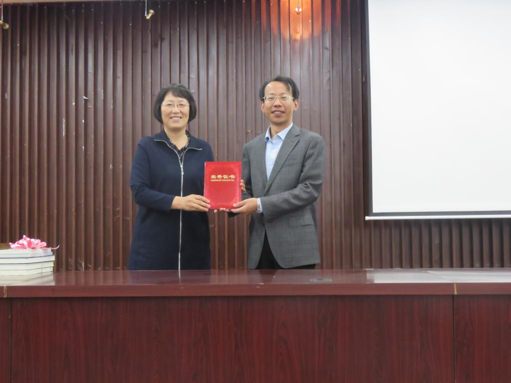 讲座结束后,进行了赠书仪式。作为对PP电子游戏平台网站六十周年校庆的祝贺,内蒙古云图教育咨询有限公司总经理张兴代表公司赠与学校价值贰万元外语图书。外国语学院院长作为代表接受了赠书。