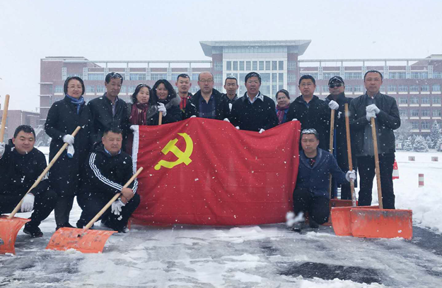 虽然路面积雪厚重,但总支所属党员及职工个个都干劲十足,大家用扫帚、铁揪清除积雪,到处呈现一幅热火朝天的扫雪景象。天寒地冻挡不住大家的热情,铁锹声此起彼伏,忙碌的身影成为校园里一道亮丽的风景。人多力量大,经过两个小时的奋战,行政楼及学校主干道路两旁的积雪都被清扫干净,确保了道路的畅通和安全。